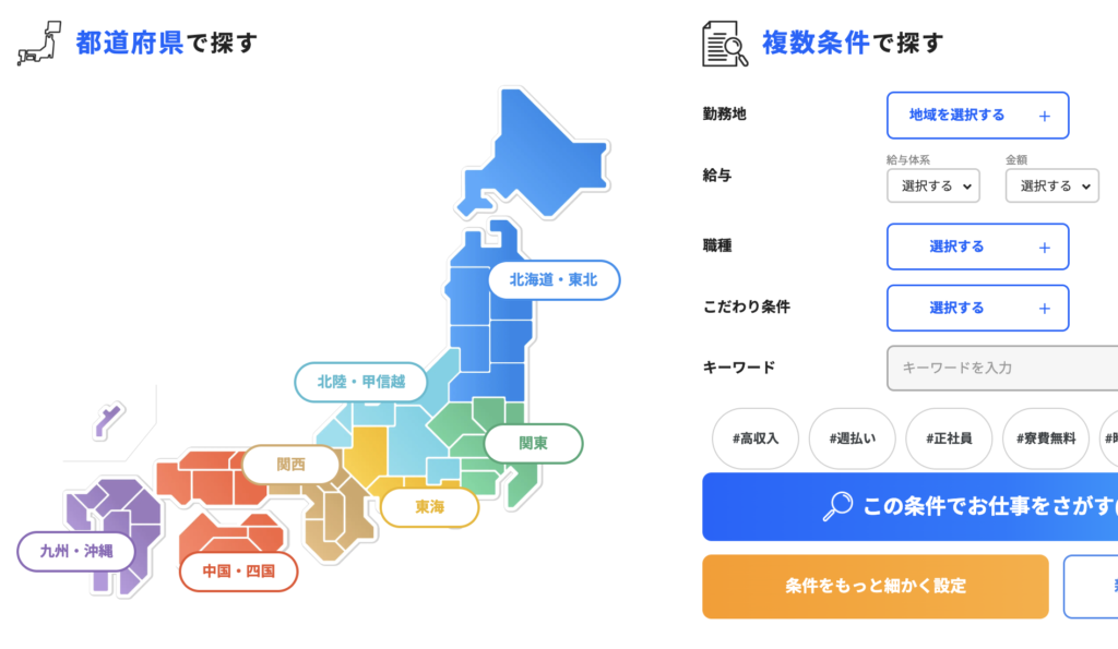 公式サイトでは「高収入」「寮完備」「資格取得支援」「未経験歓迎」「残業ほぼなし」「社員登用あり」など豊富なこだわり条件で求人を絞り込むことができます。担当者から紹介を待つだけでなく、自分でも公式サイトの検索機能を使って気になる求人を探してみることをおすすめします。